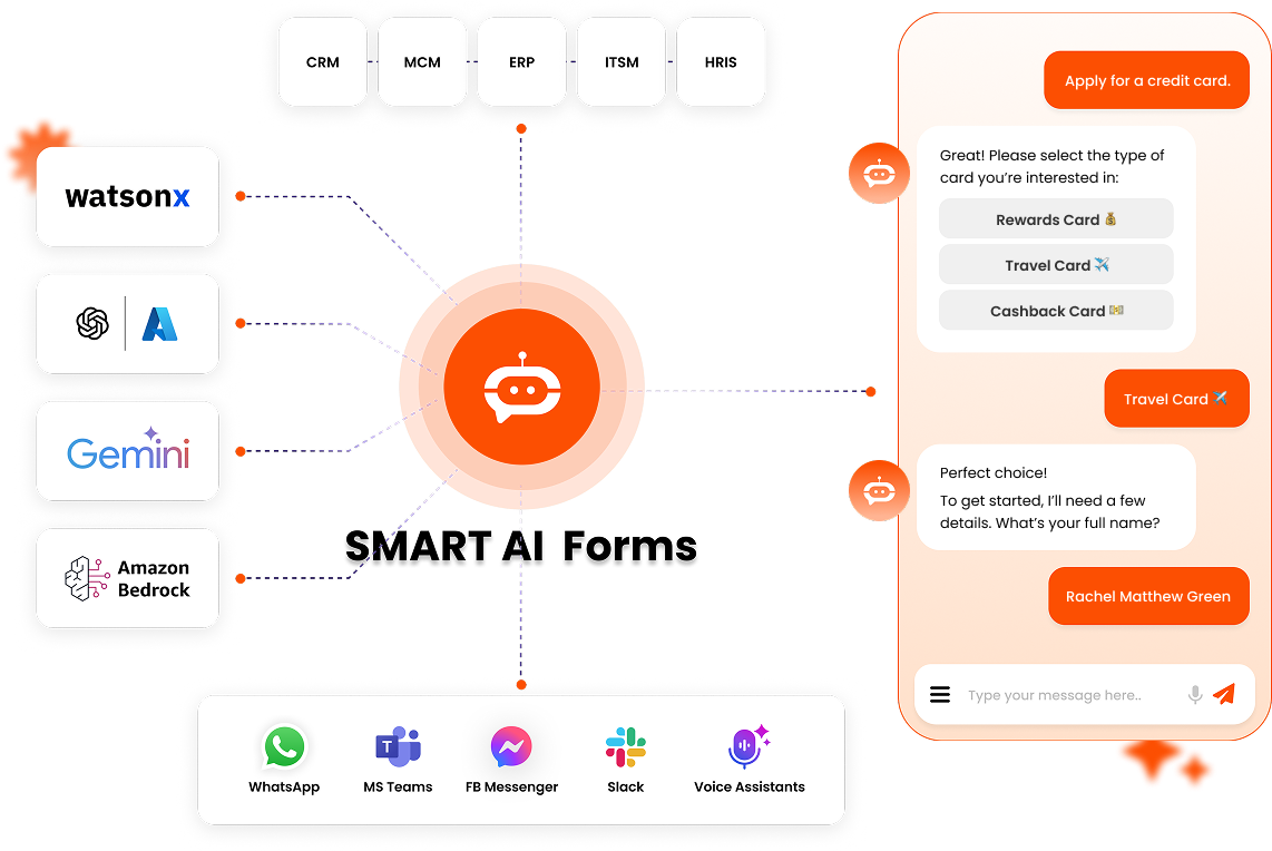 What makes the platform stand out is its reach. As an Enterprise Form Management AI, it works across channels: a WhatsApp AI Form Assistant for customers, Messenger AI Forms for service requests, AI Forms on Microsoft Teams for employee workflows, and AI Forms on Slack for IT or HR needs. This Social Media Form Integration and AI for Multi-Channel Forms approach ensures forms are always available — whether on web, mobile, or chat apps.