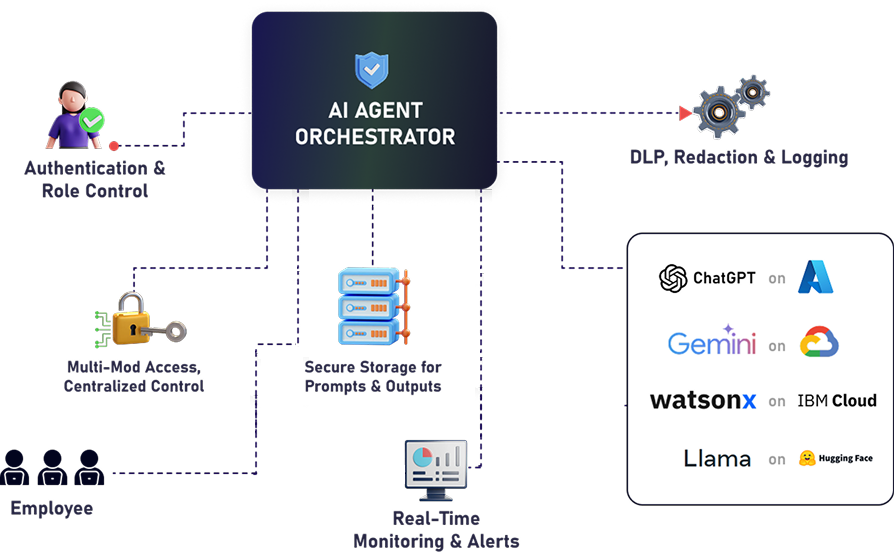 The orchestrator features enterprise-grade Data Loss Prevention (DLP) systems that inspect every prompt and output in real time, scanning for: