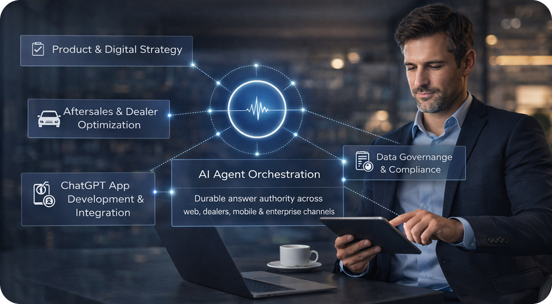 The organizations that succeed will not simply be those with the most digital content. They will be the ones whose AI agents, registered Automotive ChatGPT apps, and AEO strategies operate together as a governed system.