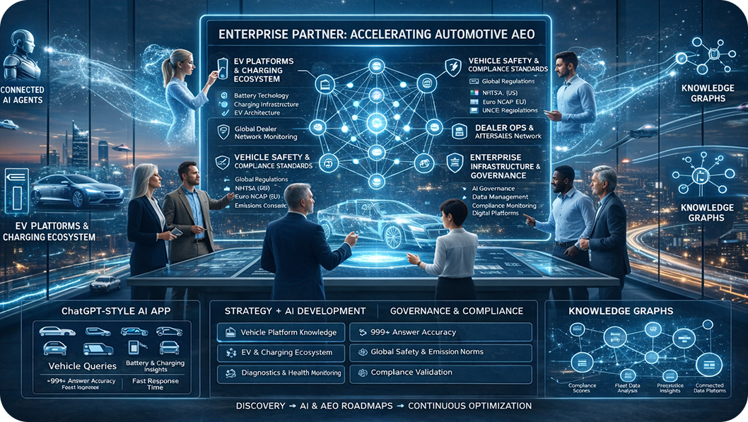 As customers move from searching to asking, the next competitive edge is not just being online—it is being the source AI trusts to explain. Explore how we can help you implement AEO, AI agents, and ChatGPT app registration effectively for the automobile industry.