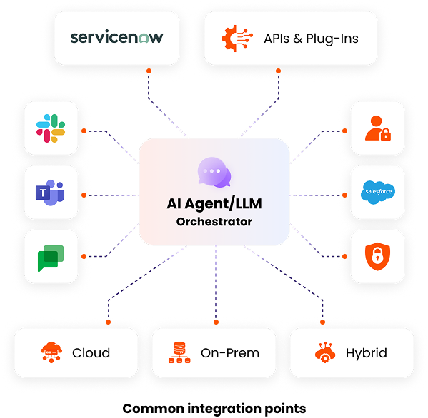 An LLM Orchestrator supports this by offering API connectors and plug-ins and can sync with IAM systems like SAML and LDAP for secure, role-based access.