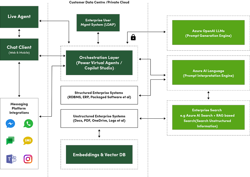 Employees submit queries via Teams, intranet, or mobile. The orchestration layer authenticates users through Azure Active Directory and applies access controls.